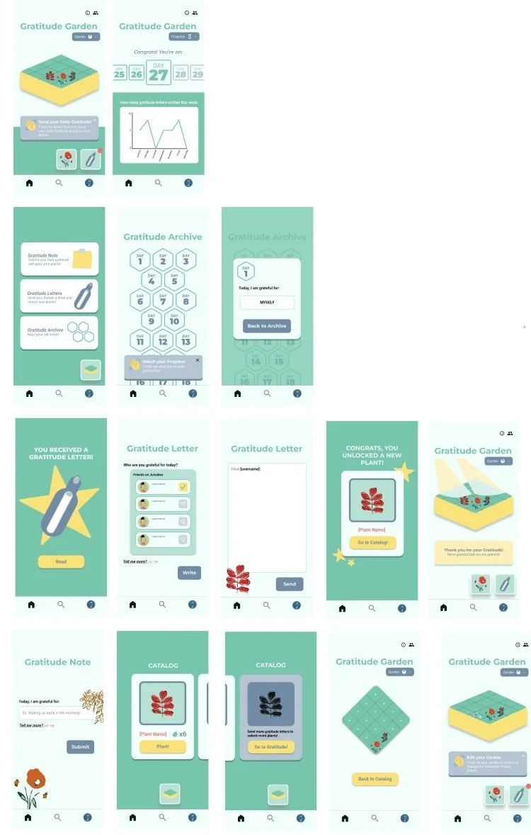 Gratitude Garden is one of our design solutions, which is primarily a maintenance widget where users are provided multiple options of garden biomes and plant options obtainable through daily gratitude notes