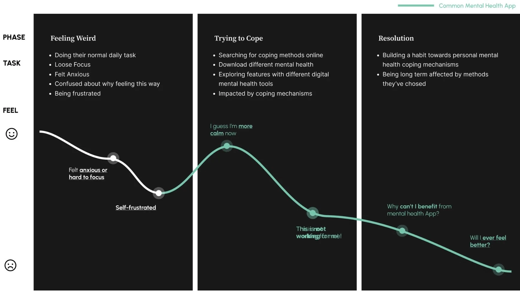 Compiling the information we received from our users, we created their user journey through typical mental health resources
