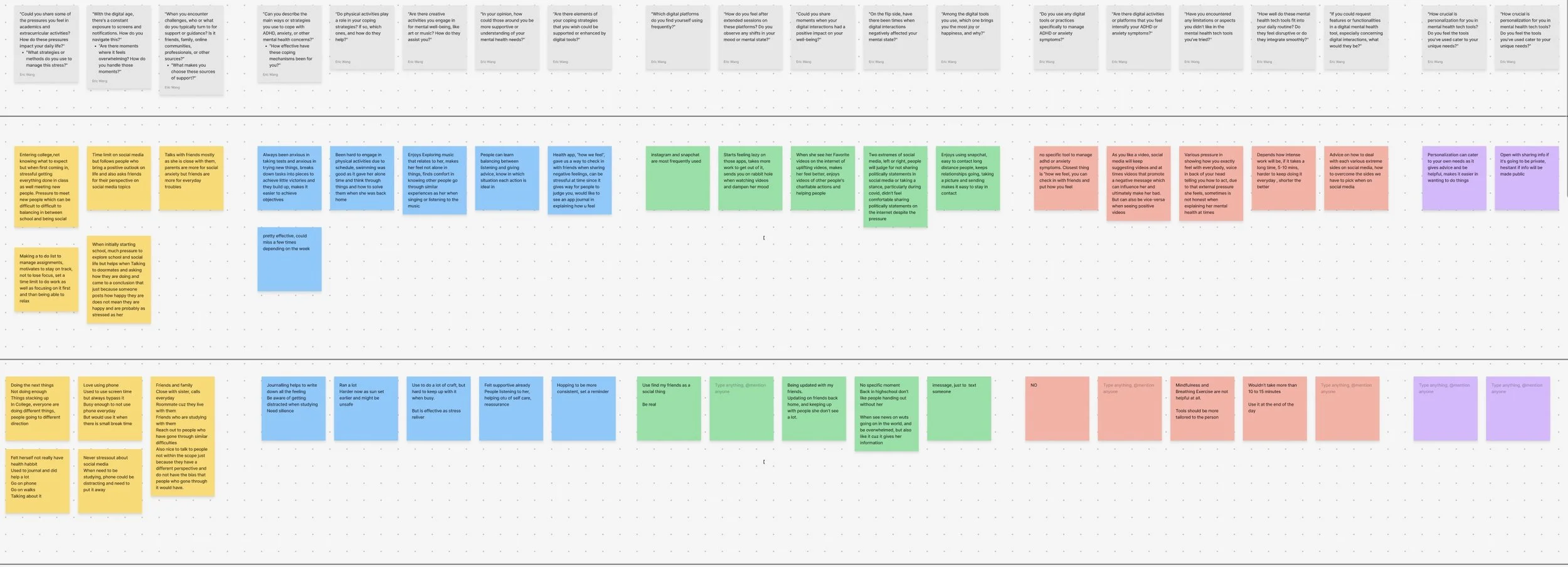 We interviewed 10 people consisting from gen x and gen alpha. we asked them questions regarding technology usage, obstacles in everyday life and their copping mechanisms through those challenges Divided their answers into different categories
