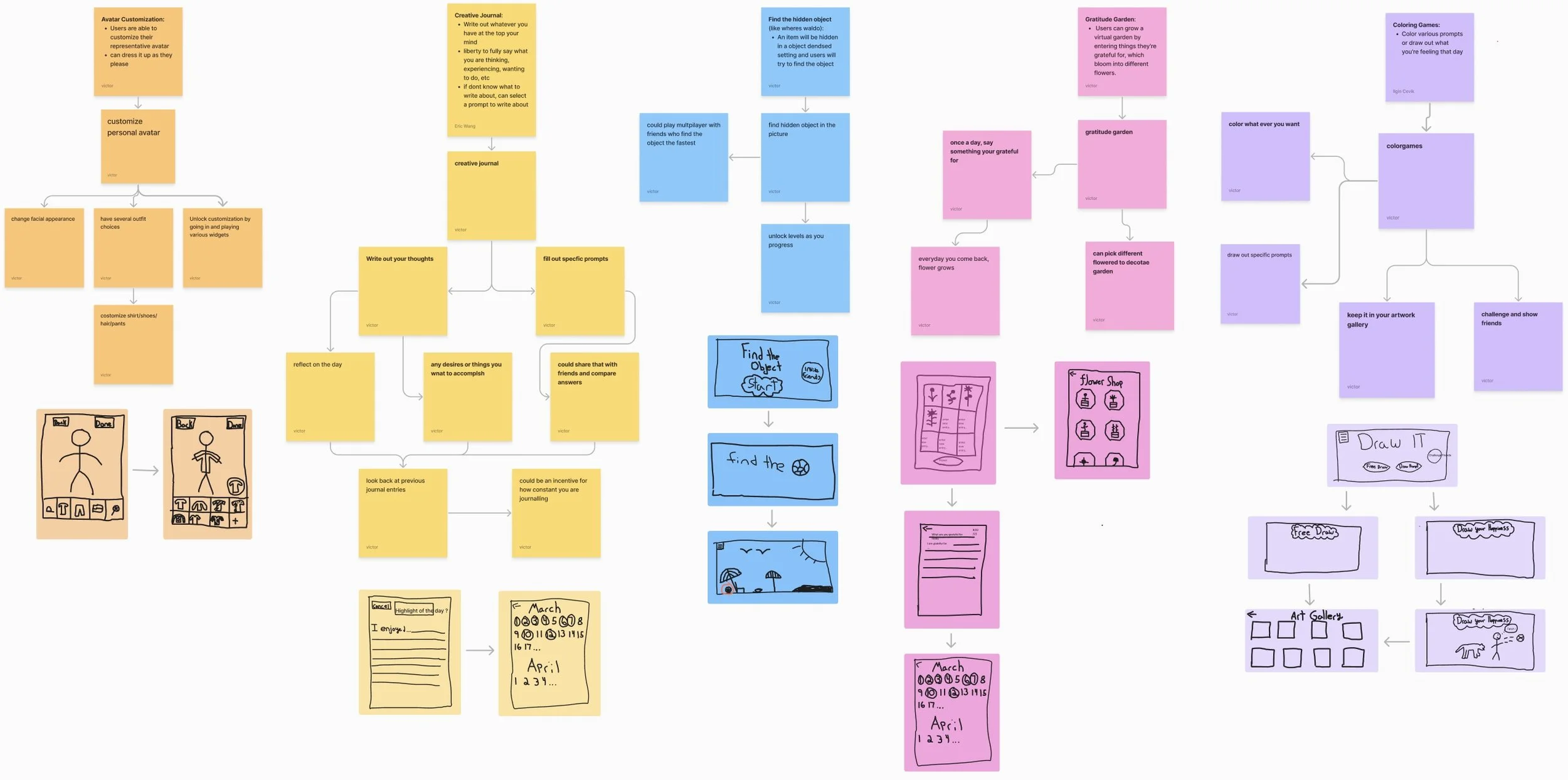 We finalized our selection into two widget based on a impact-effort matrix; Gratitude Garden (a maintenance gamified widget based on caring for a garden with one's gratitude) and Color It (a coloring game with new daily palettes to stimulate thinking skills)