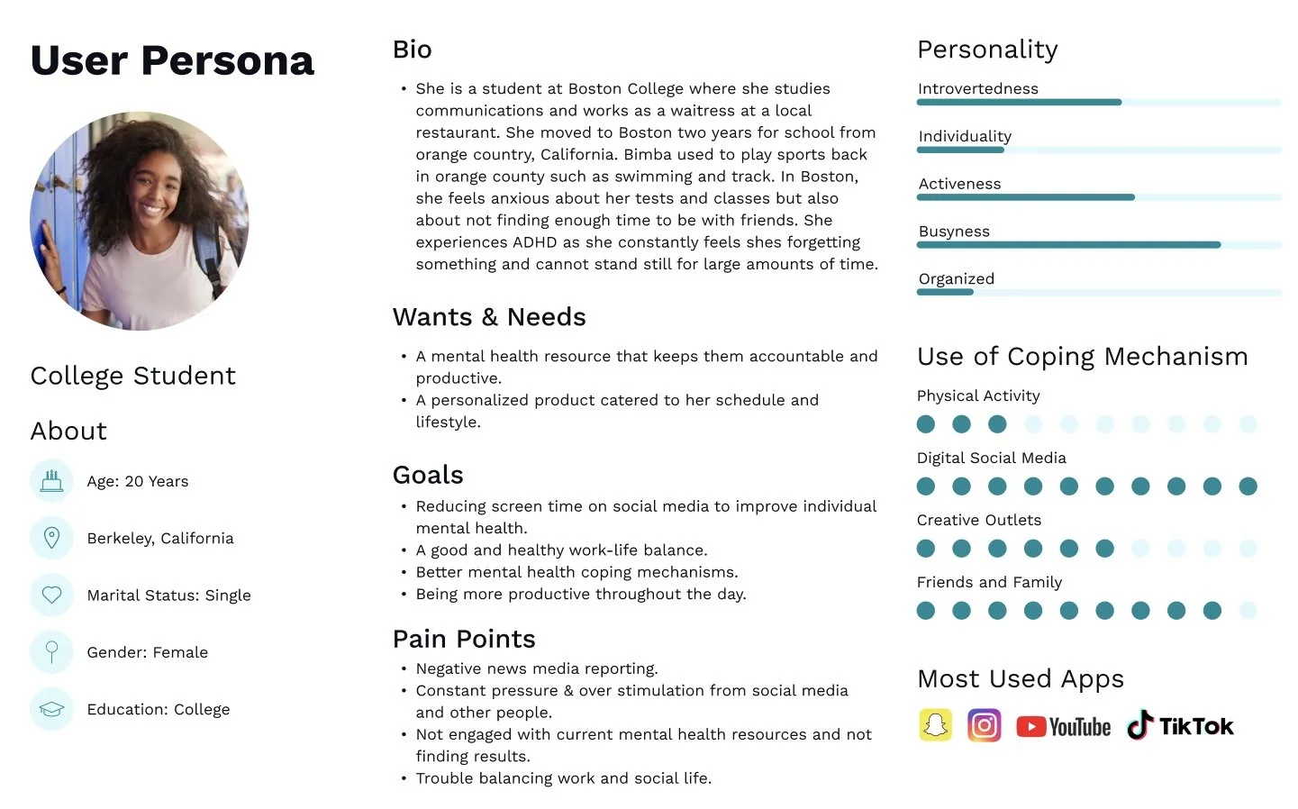 We used the users awareness of mental health and current situations to form our user persona. We created persona due to our users overwhement with their responsibilities and lack of awareness of mental health resources.
