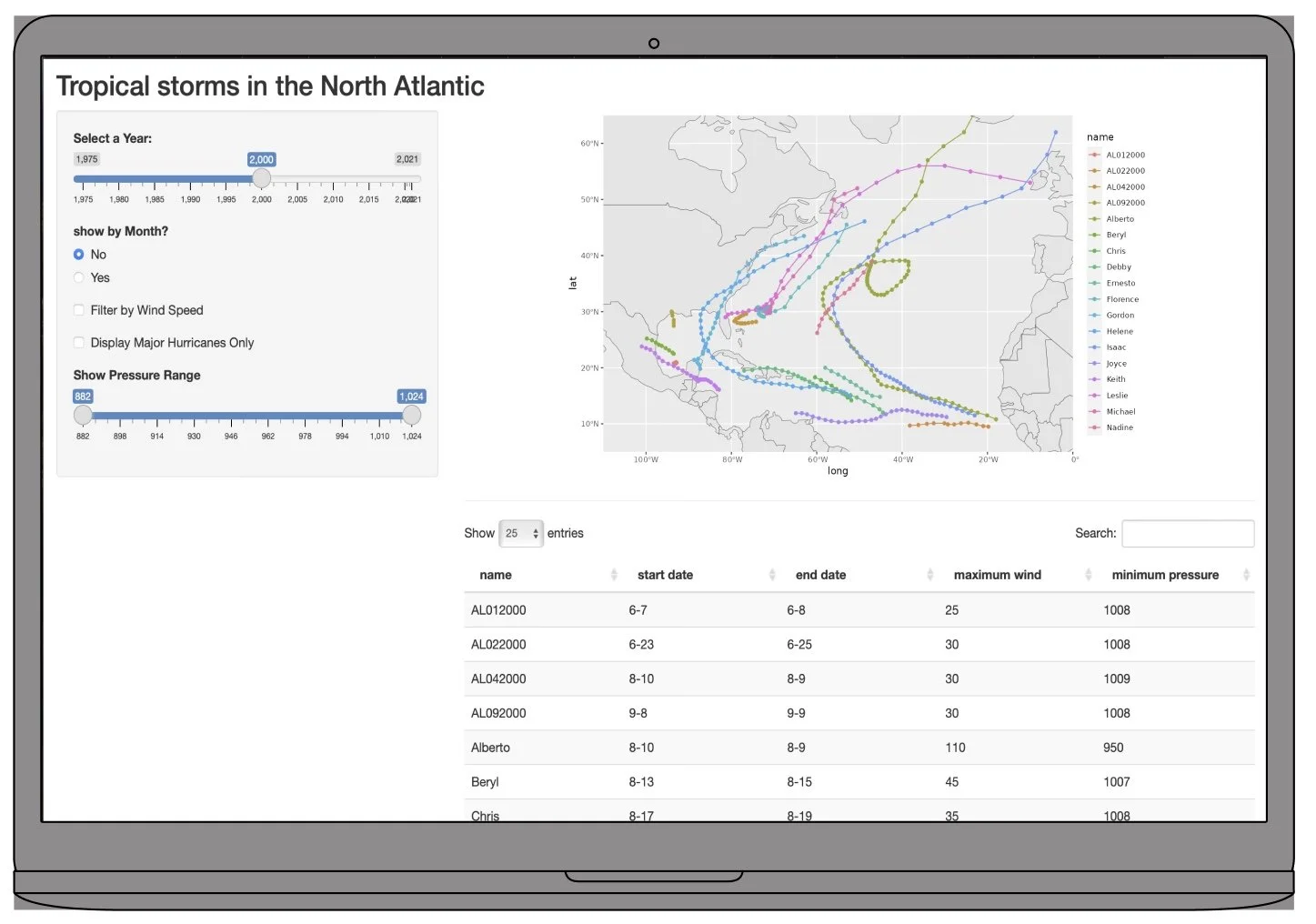 I developed a Shiny app at UC Berkeley to visualize the trajectories of North Atlantic tropical cyclones from 1975 to 2021. The app uses various interactive filters to sort storms by year, month, and wind speed, with an option to highlight major hurricanes exclusively. Built using R's dplyr for data manipulation and ggplot2 for dynamic mapping, the app provides an intuitive and comprehensive tool for exploring storm data. Published on shinyapps.io, this project highlights my ability to design engaging and insightful data visualizations.